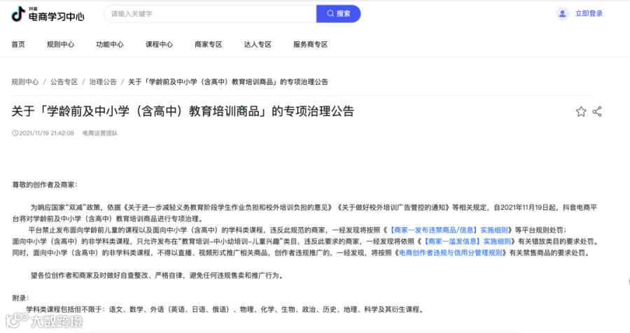 在此之前,抖音电商运营团队于11月19日也发布公告,称将禁止发布面向学龄前儿童的课程以及面向中小学(含高中)的学科类课程;面向中小学(含高中)的非学科类课程,只允许发布在“教育培训-中小幼培训-儿童兴趣”类目。同时,面向中小学(含高中)的非学科类课程,抖音电商规定:不得以直播、视频形式推广相关商品,创作者违规推广的,一经发现,将按照《电商创作者违规与信用分管理规则》有关禁售商品的要求处罚。