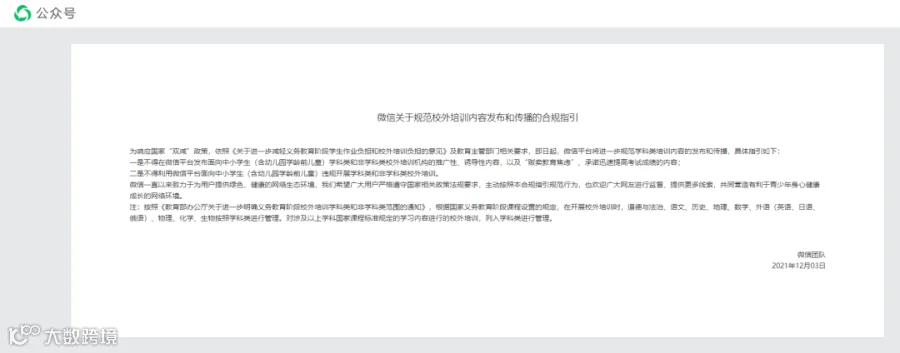 日前,微信团队在微信公众平台发布“微信关于规范校外培训内容发布和传播的合规指引”。