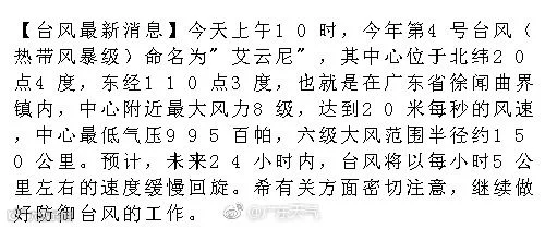 登陆广东后,“艾云尼”或在广东西南部一带徘徊三天左右,影响时间长。