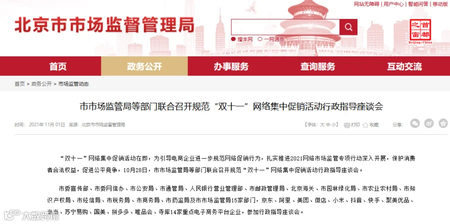 在即,为引导电商企业进一步规范网络促销行为,保护消费者合法权益,促进公平竞争,北京市市场监管局等部门近日联合召开规范“双十一”网络集中促销活动行政指导座谈会。