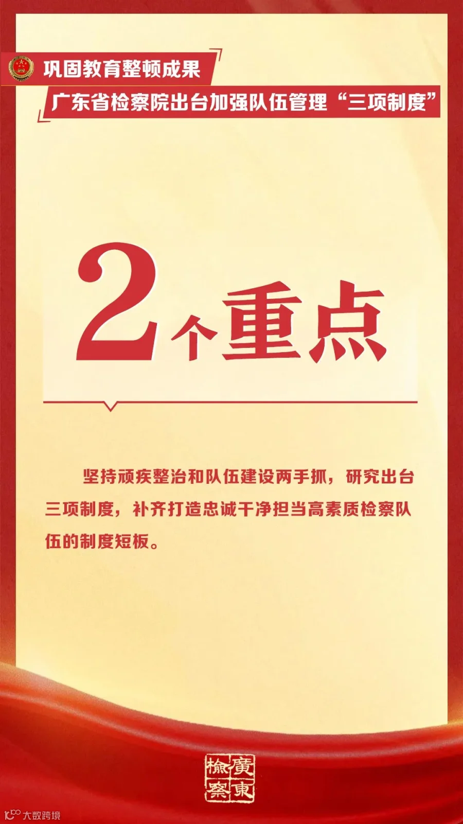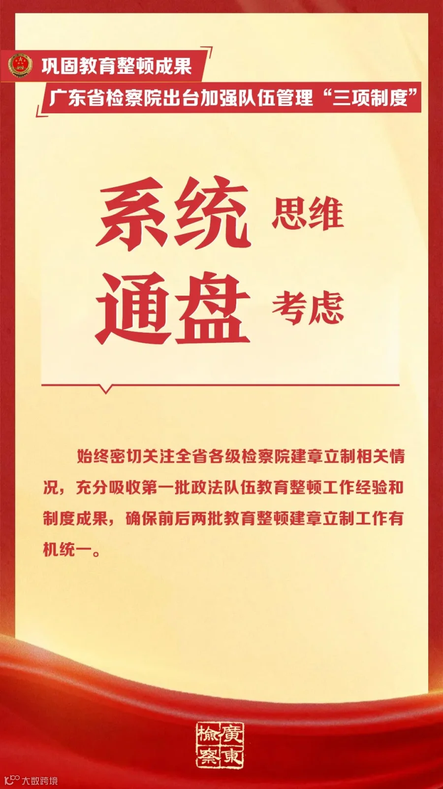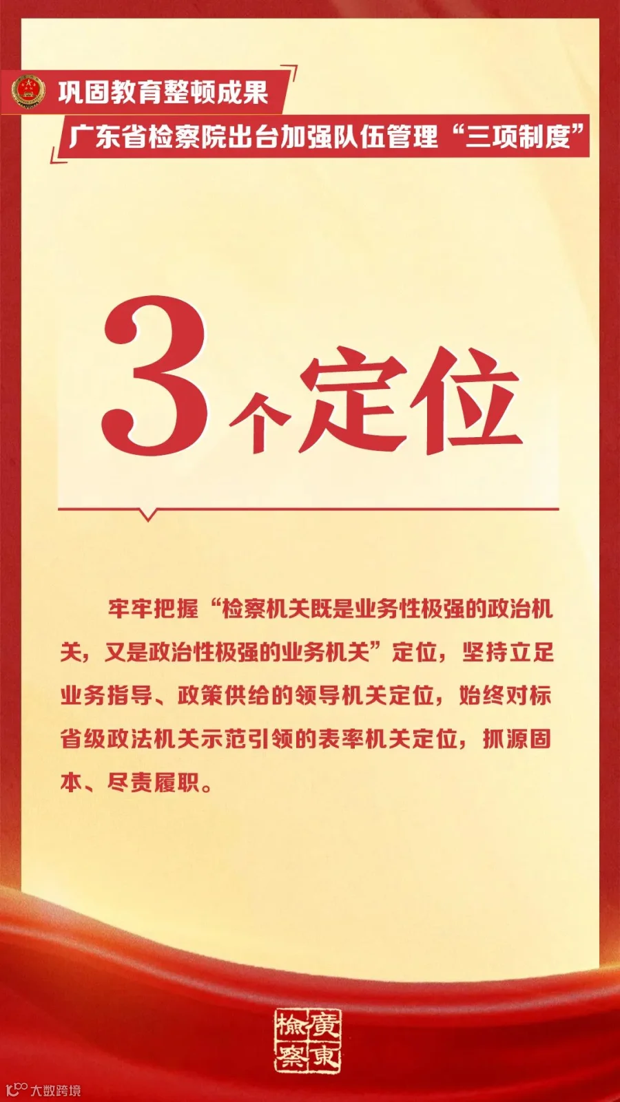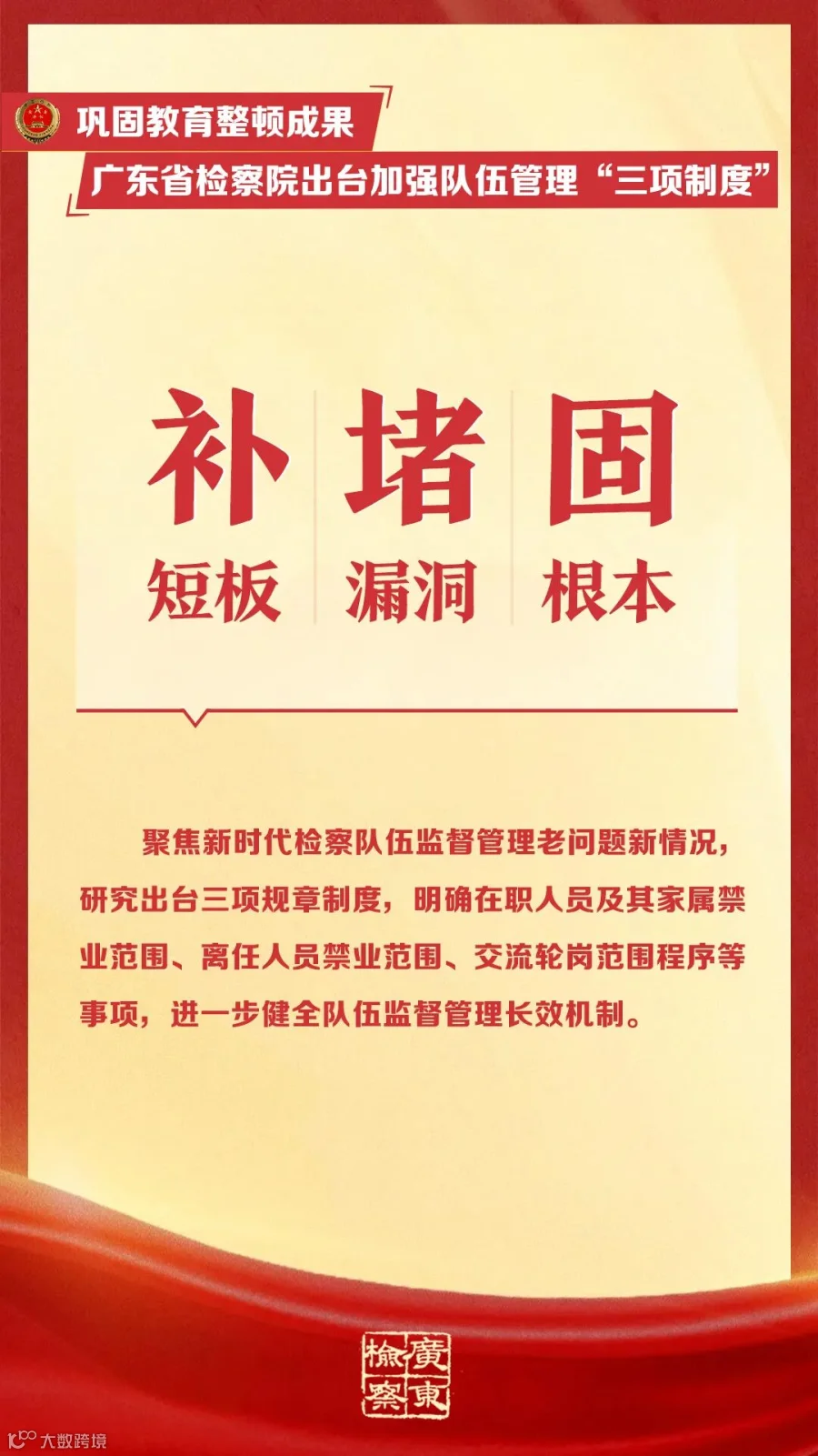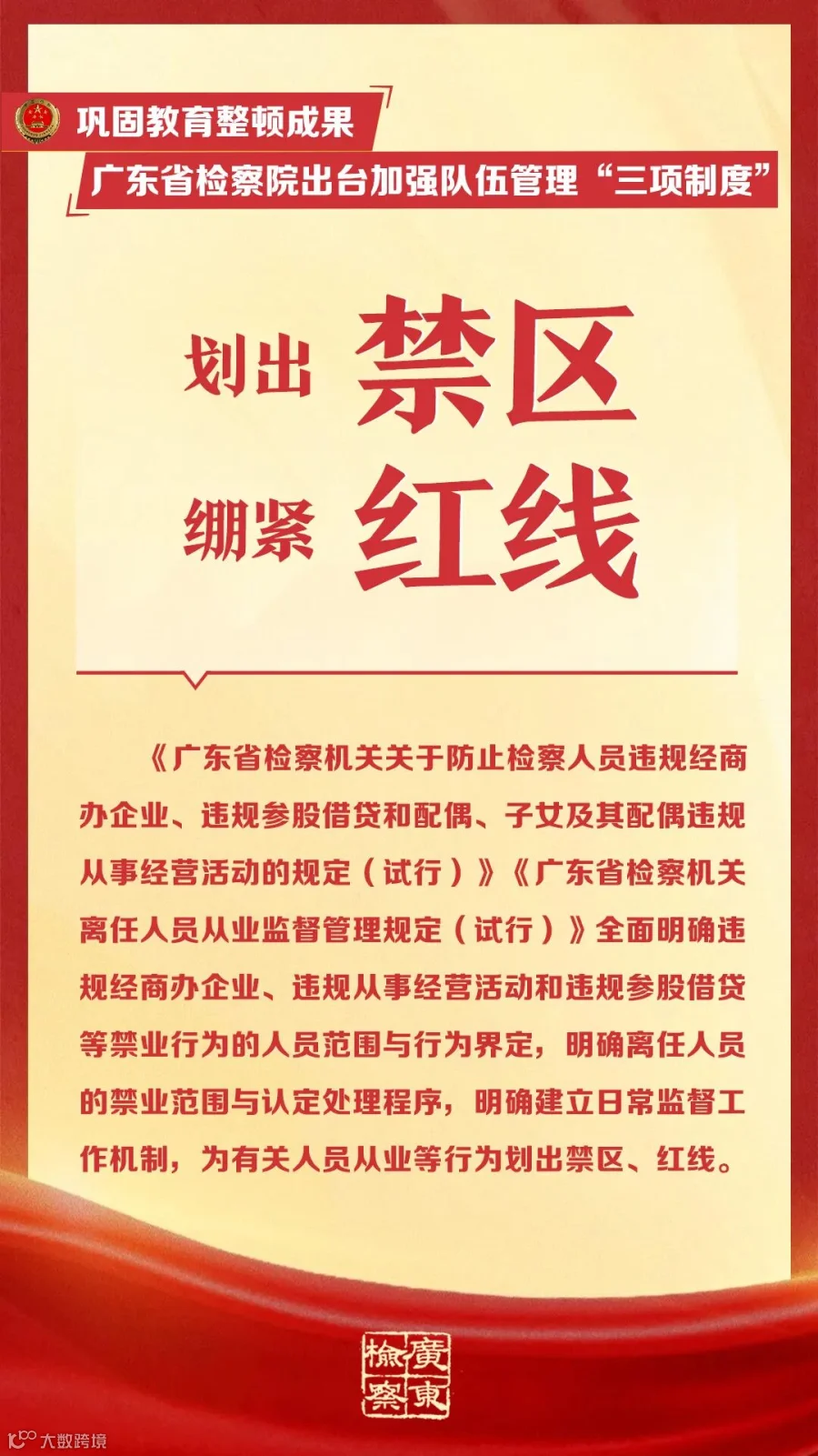 近日,广东省检察院制定出台《广东省检察机关关于防止检察人员违规经商办企业、违规参股借贷和配偶、子女及其配偶违规从事经营活动的规定(试行)》《广东省检察机关离任人员从业监督管理规定(试行)》《广东省检察机关检察人员交流轮岗工作规定(试行)》等三项强化检察队伍管理制度规范(☞戳这里回顾),以建章立制举措巩固教育整顿成果。下面,一起来看其中的“干货”吧!