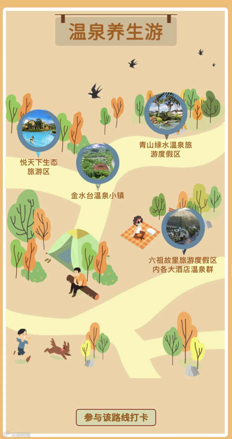 温泉养生游(悦天下生态旅游区——金水台温泉小镇——青山绿水温泉旅游度假区——六祖故里旅游度假区内各大酒店温泉群)
