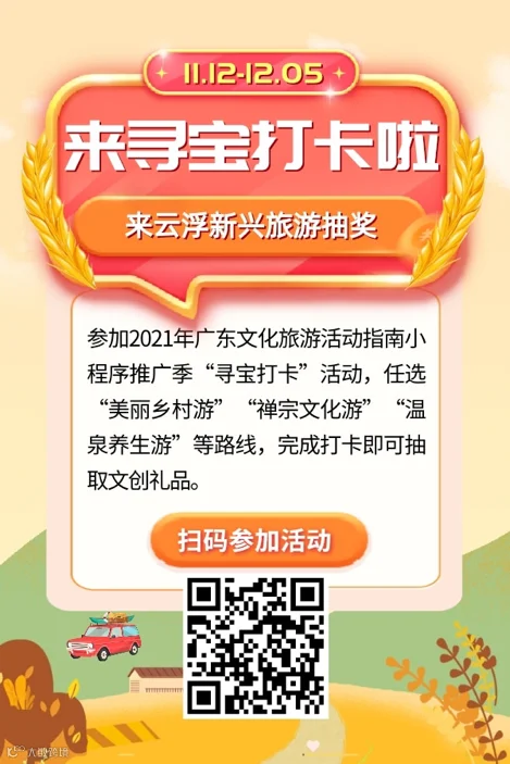 由广东省文化和旅游发展与保障中心指导,南方网精心制作的“畅游云浮 寻宝打卡”H5游戏于今天在“广东文化旅游活动指南”小程序上线了。“畅游云浮 寻宝打卡”h5游戏是2021年广东文化旅游活动指南小程序推广季暨云浮市新兴县智慧文旅活动的配套内容之一,设置“美丽乡村游”“禅宗文化游”“温泉养生游”3条路线,每条路线有5-6个地标性景区作为寻宝地点。选取其中1条路线进行景点的“人+景”合照打卡,完成后即可参加抽奖活动。