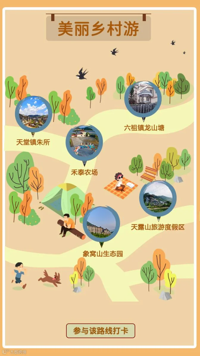美丽乡村游(天堂镇朱所——禾泰农场——六祖镇龙山塘——天露山旅游度假区——象窝山生态园)
