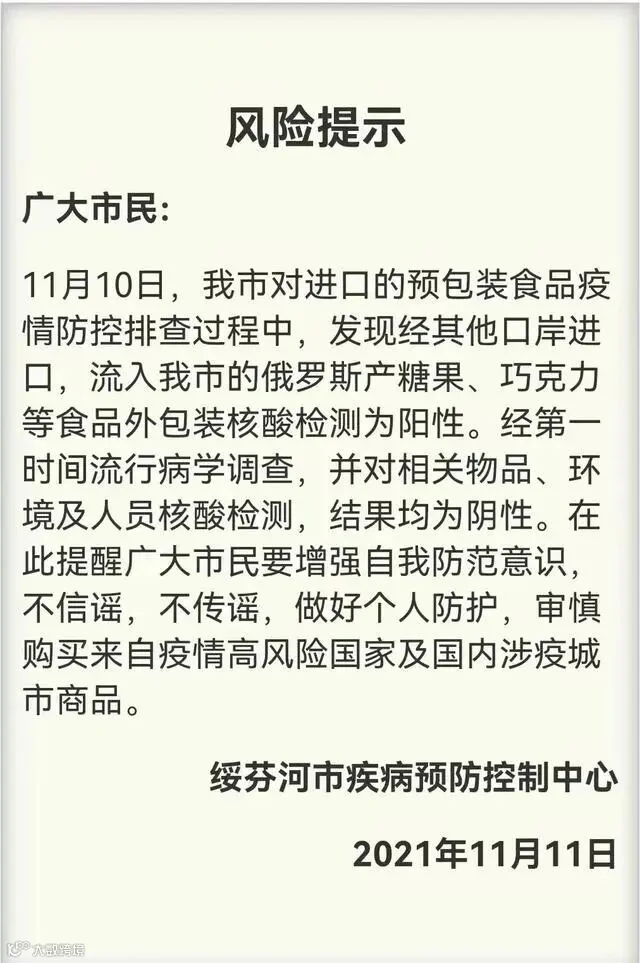 绥芬河市疾控中心11月11日发布的《风险提示》称,11月10日,该市在对进口的预包装食品排查过程中,发现经过其他口岸进口、流入到该市的俄罗斯产糖果、巧克力等食品外包装核酸检测为阳性。经过第一时间流行病学调查,相关物品、环境以及人员的核酸检测后结果均为阴性。