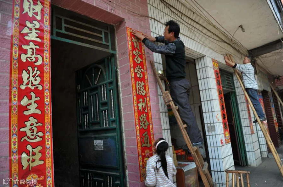 到了傍晚,每家每户都贴“年红”,或新年画,或传统“门神”,而对联大多与福财之类有关。大门口贴一副对联,里面的房间门口和上下楼梯也会贴利是。
