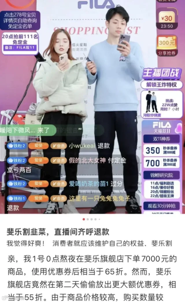“双11”预售期间,斐乐在直播间承诺满2000元减400元是最大优惠力度,叠加电商平台优惠,总共是满2000元减700元。“当时花了很长时间才抢到优惠券,预付定金购买优惠券后,又在11月1日零点付清尾款。然而,11月2日该店又放出1万张叠满2000元减900元的券,不用付定金也不用抢,提前付款的都被当韭菜割了。”