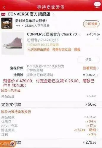 消费者投诉称,定金加尾款购买一双匡威需支付569.17元,而同样的商品在预售结束的现卖中仅需支付558.5元。