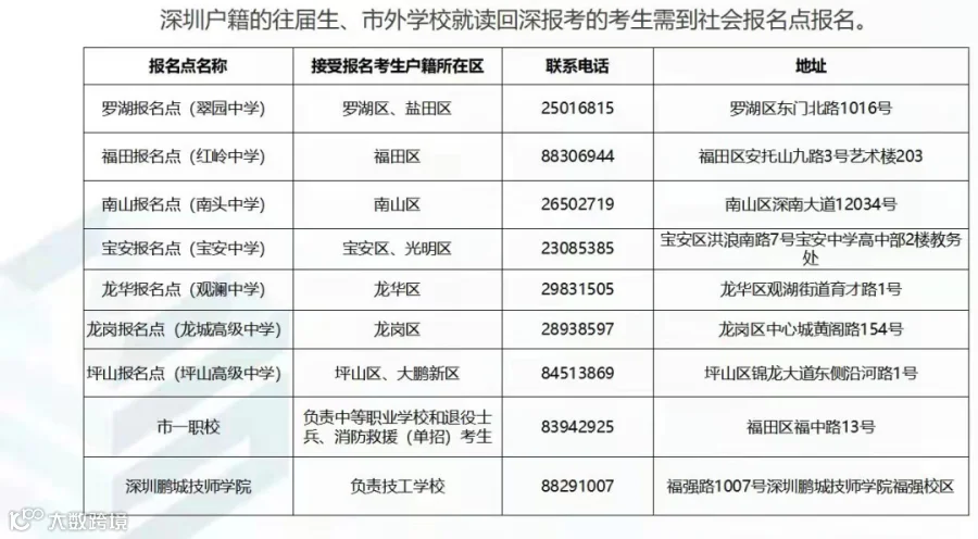在户籍所在区的社会报名点报考。(如:深圳市外户籍的往届毕业生回户籍所在地报考);能否在原高中毕业学校所在地(市)报考,按当地规定执行。