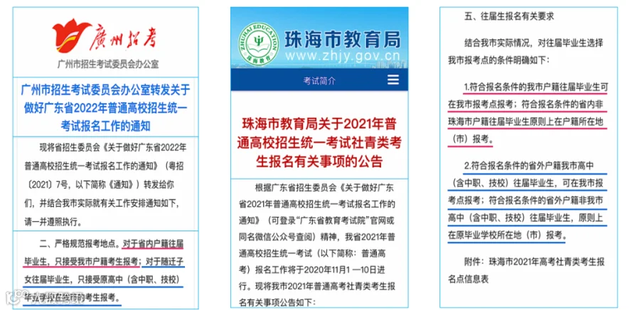 在原高中(含中职、技工学校)毕业学校所在区社会报名点报考;能否在父母居住证所在地(市)报考,按当地规定执行;不得在其它地市借考。可以各地(市)教育局官网查看。