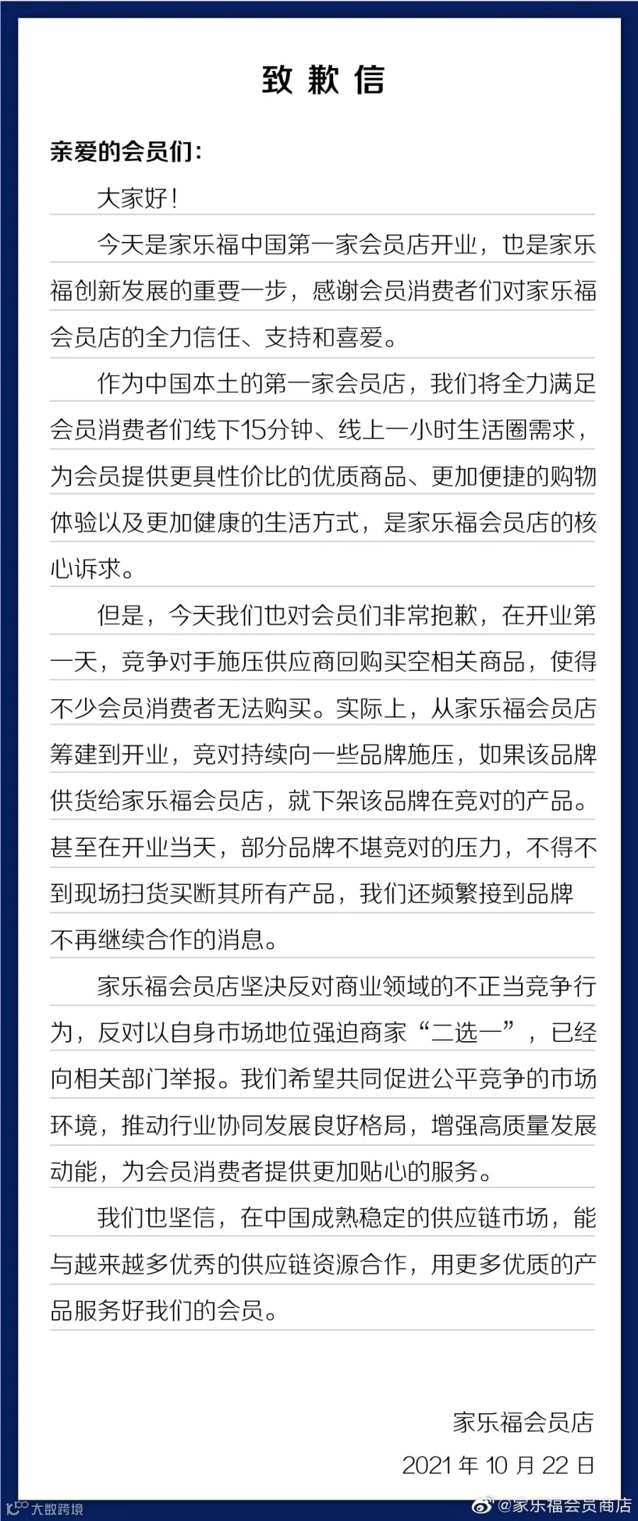 10月22日晚,家乐福会员店深夜发布公开信。据公开信内容,在开业首日,竞争对手施压供应商回购买空相关商品,使得不少会员消费者而无法购买。家乐福还透露,从家乐福会员店筹建到开业,竞对持续向一些品牌施压,如果该品牌供货给家乐福会员店,就下架该品牌在竞对的产品。甚至在开业当天,部分品牌不堪竞对的压力,不得不到现场扫货买断其所有产品。此外,家乐福方面还频繁接到品牌不再继续合作的消息。
