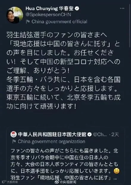 据@央视新闻 报道,近日,国际奥委会执行委员会会议决定,北京冬奥会及冬残奥会不面向境外观众售票。前日(1日),华春莹回应中国驻日大使馆收到的一项“嘱托”:“羽生结弦粉丝们,我看到(有日本民众)发声:‘现场加油,就拜托中国观众了。’交给我们吧!感谢对中国新冠防疫措施的理解!”不少日本网友对此表达感谢。