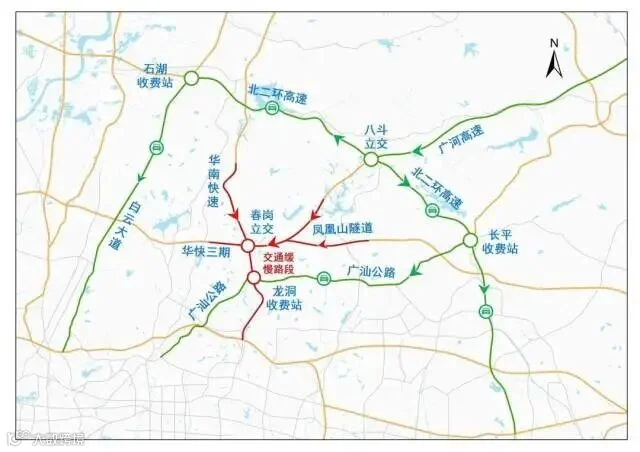 为避开春岗立交段行车缓慢,建议粤东地区返程旅客通过北二环高速长平收费站转广汕公路进入市区,或者进入广佛肇高速凤凰山段黄麻收费站转广汕公路进入市区。