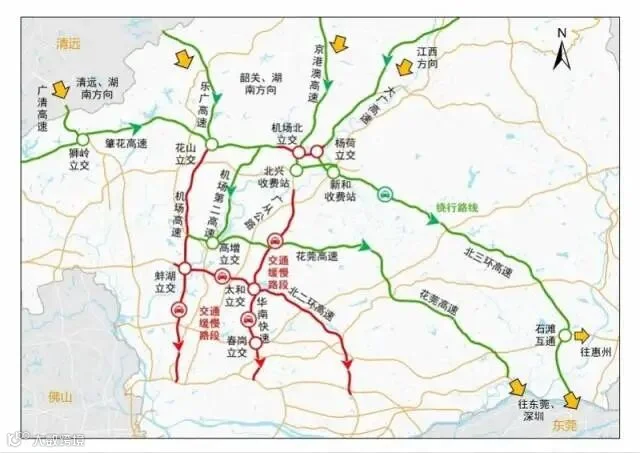 建议来自韶关、湖南方向车主高峰时期可以通过北三环-机场二高或地面道路绕行。建议来自机场的旅客高峰时期可以通过花莞高速、鹤龙路(G106)或其他地面道路绕行。