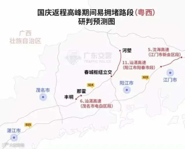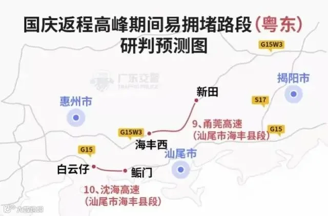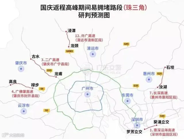 据广东交警研判,预计10月5日起,新一波的短途出行车流有可能出现,假期后期(10月6-7日)中心城市进城方向、省际省内主干道将出现返程高峰。此外,广东交警也发布了国庆返程高峰期间易拥堵路段交通绕行指引。