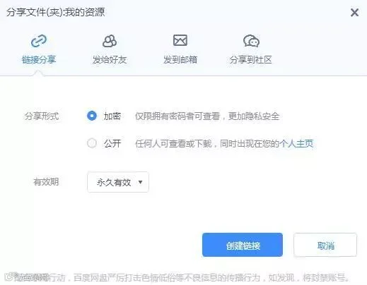 2、将网盘当网盘用的:如果你是一个好人或是出于工作需要,有很多资料想和大家分享。那就用加密分享吧~另外有效期上也可以根据需要选择1天、7天或是永久有效。目前百度已经作了一些调整: