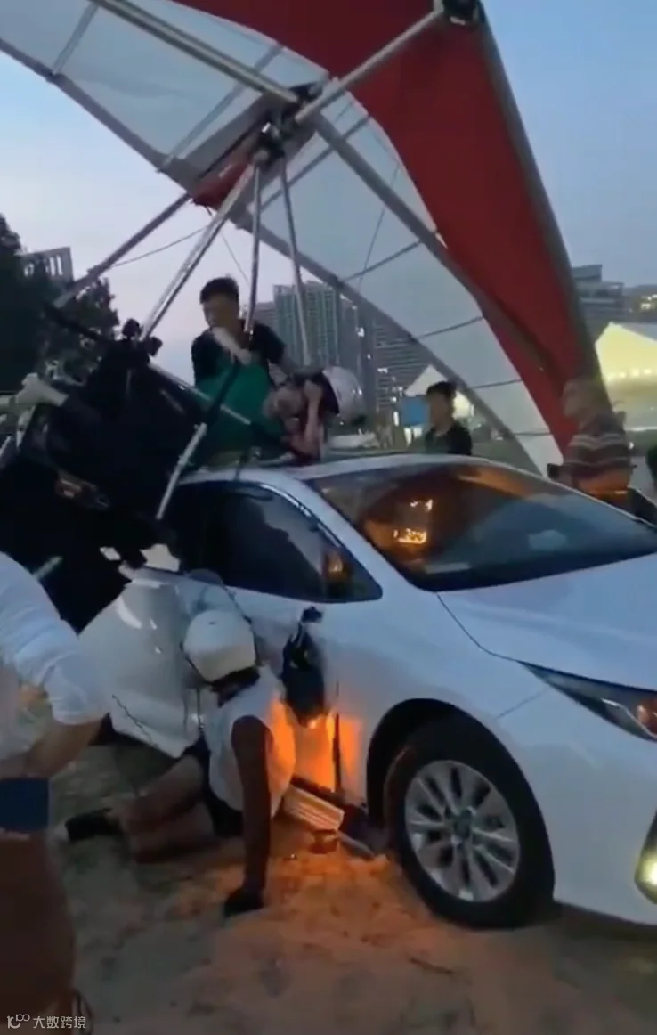 视频显示,红白机翼的滑翔机斜着卡在白色车顶,已脱身的驾驶员倚靠着车门,像是惊魂未定。人群围绕车辆,试图合力救出仍然卡在车顶与滑翔机之间的乘客。
