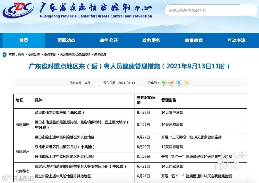 9月14日,根据疫情情况,广东省疾控中心最新更新广东省对重点地区来(返)粤人员健康管理措施,新增对福建泉州市泉港区界山镇东丘村(中风险)来粤返粤人员进行14天居家隔离;新增对福建泉州市除泉港区界山镇东丘村这一中风险地区外其他地区来粤返粤人员,开展“四个一”健康管理和14天自我健康监测,“四个一”健康管理,即发放一份健康告知书、开展一次健康问询、查验一次健康码、开展一次核酸检测。