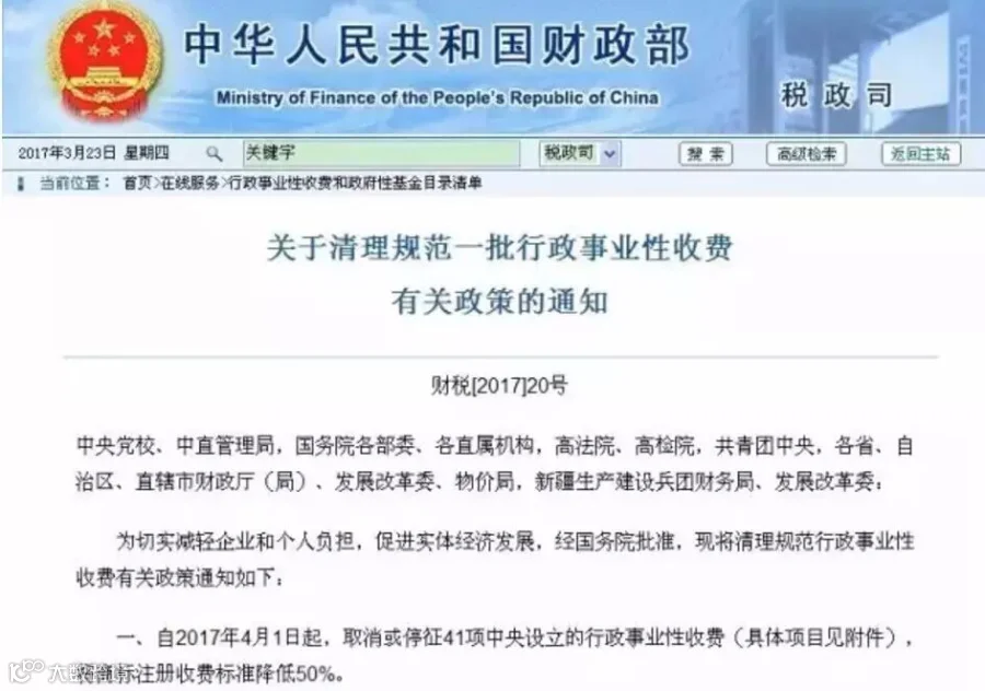 近日,财政部、国家发改委两部门印发了《关于清理规范一批行政事业性收费有关政策的通知》,41项中央设立的行政事业性收费将于2017年4月1日取消或停征,同时将商标注册收费标准降低50%。