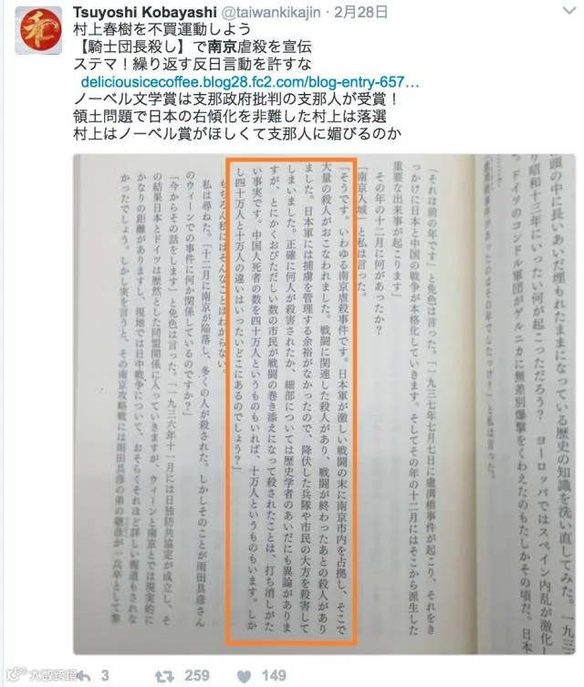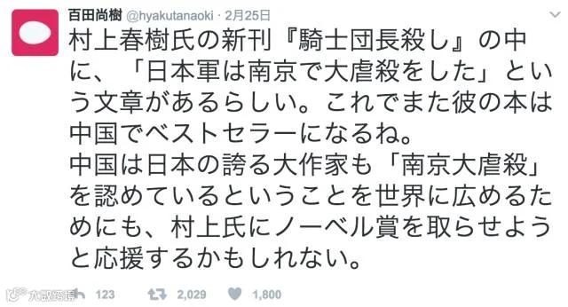 事情是这样的:2月24日,村上春树的新书《骑士团长杀人事件》开始发售,书中提及了日本军队在南京的大屠杀。