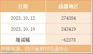 据四川省钢材流通协会统计,截止10月19日成都地区样本库房中螺纹钢及线材库存总量为243419吨,较上周减少30965吨,较去年同期减少112945吨。本期社会库存继续减少,因贸易商仍以出货为主。