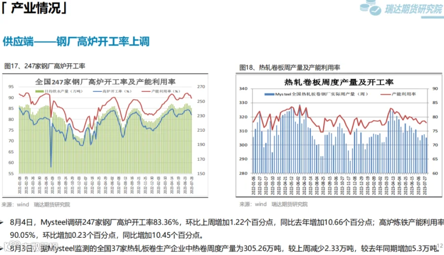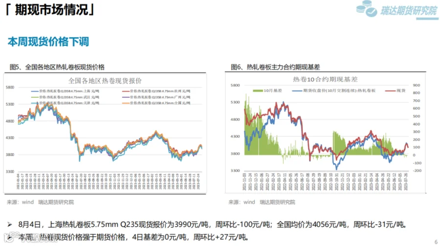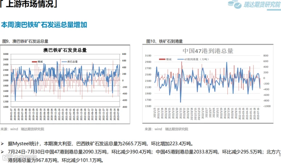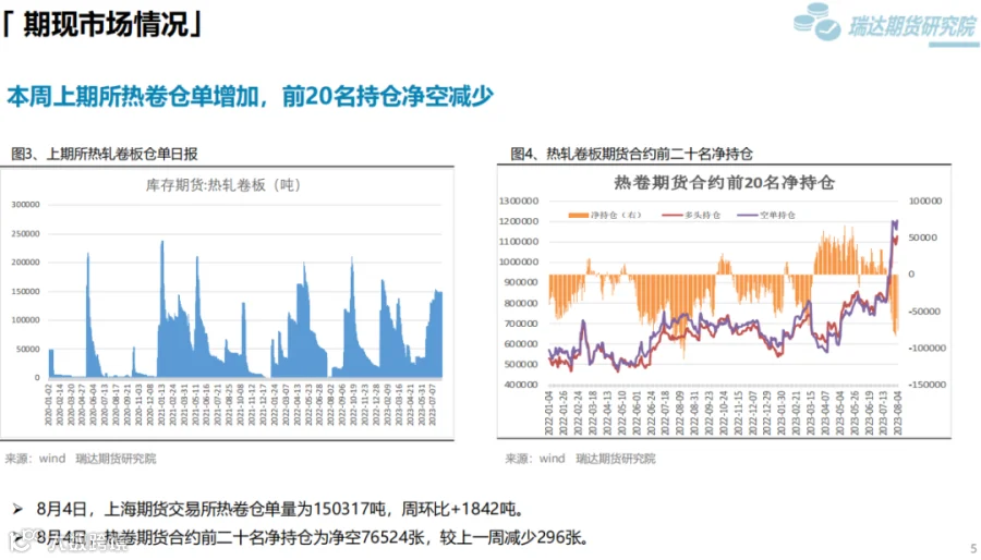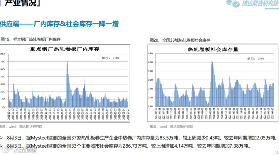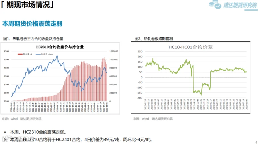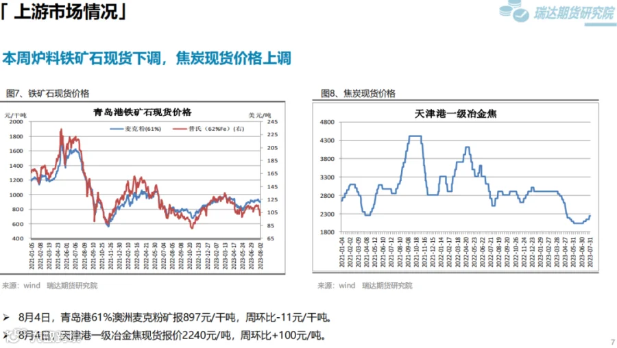 本周(7.28-8.4)热卷价格减仓下行。近两周热卷价格受利好支撑持续走高,而价格的连续上涨令市场出现恐高心理,高价位成交减弱。随着现货成交量下滑,库存回升并拖累表现需求。下周(8.4-8.11)供应端,热卷周度产量由增转降,但仍高于去年同期5万多吨,另外受粗钢平控预期,产量或稳中有降。需求端,当前仍处消费淡季,终端需求表现一般,库存量回升。最后,近期宏观面利好提振的乐观情绪有所减弱,市场关注焦点再度转移至终端需求。