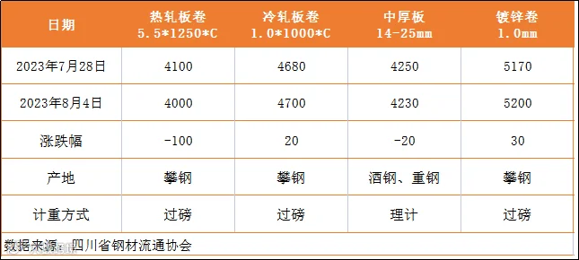 表一:本周四川市场部分板材价格变化汇总(单位:元/吨)