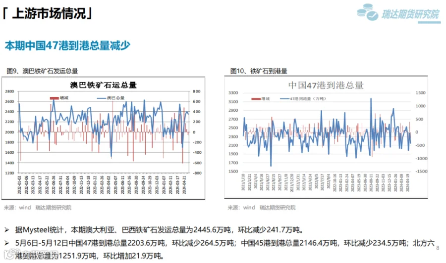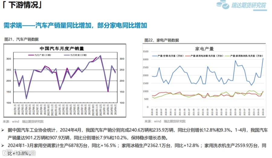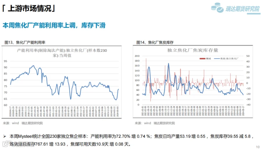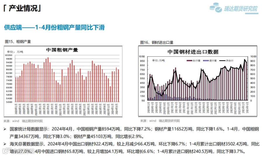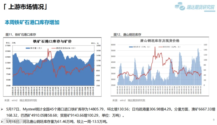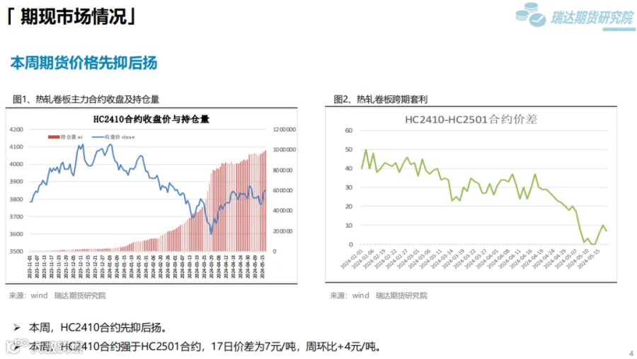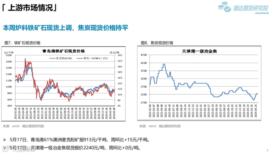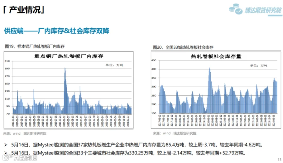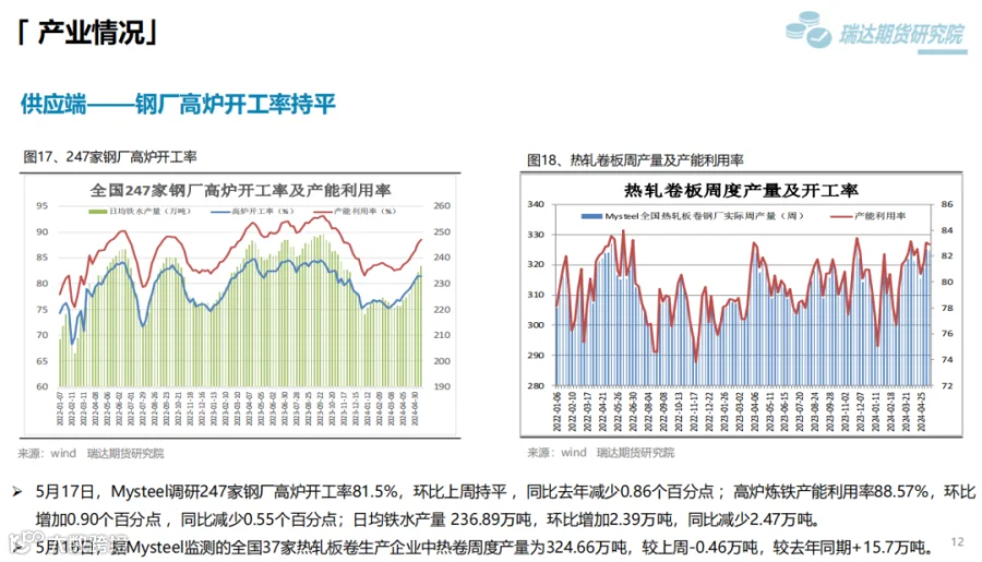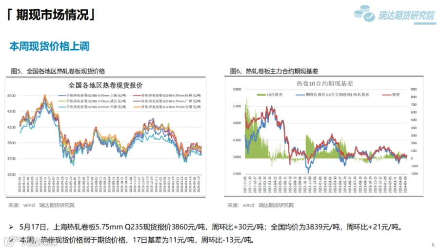 本周(5.10-5.17)热卷价格止跌反弹。周初整体表现疲软,由于炉料价格下滑,炼钢成本支撑减弱,同时美国宣布在原有对华301关税基础上,进一步提高对自华进口的电动汽车、锂电池、光伏电池等产品的加征关税,市场情绪受挫,热卷期现货价格承压下行。但随着五部门开展新能源汽车下乡活动,提振市场信心,同时房地产利好政策持续释放,带动黑色系继续走高。下周(5.17-5.24)供应端、热卷周度产量小幅下滑,但产能利用率维持在83%附近,现货供应相对宽松。需求端,下游基本按需采购为主,增量有限,库存量小幅下滑,表观需求整体尚可。最后,利好政策及炼钢成本,对热卷价格仍构成支撑。