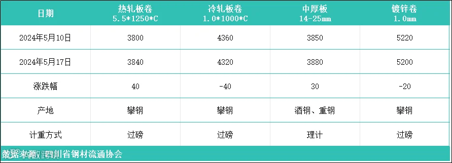 据四川省钢材流通协会对本周成都现货市场监测显示:热轧板卷较上周价格上涨40元/吨;冷轧板卷较上周价格下跌40元/吨;中厚板较上周价格上涨30元/吨;镀锌卷较上周价格下跌20元/吨。