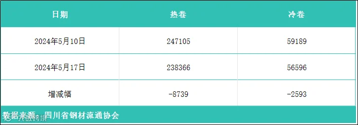 据四川省钢材流通协会统计,本周成都地区样本库房中热卷库存量为238366吨,较上周减少8739吨。冷卷库存量为56596吨,较上周减少2593吨。