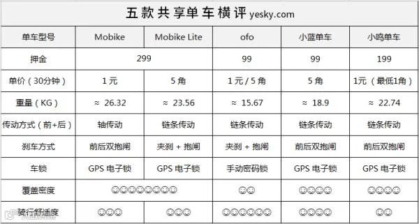 五款主流共享单车横向测评结果