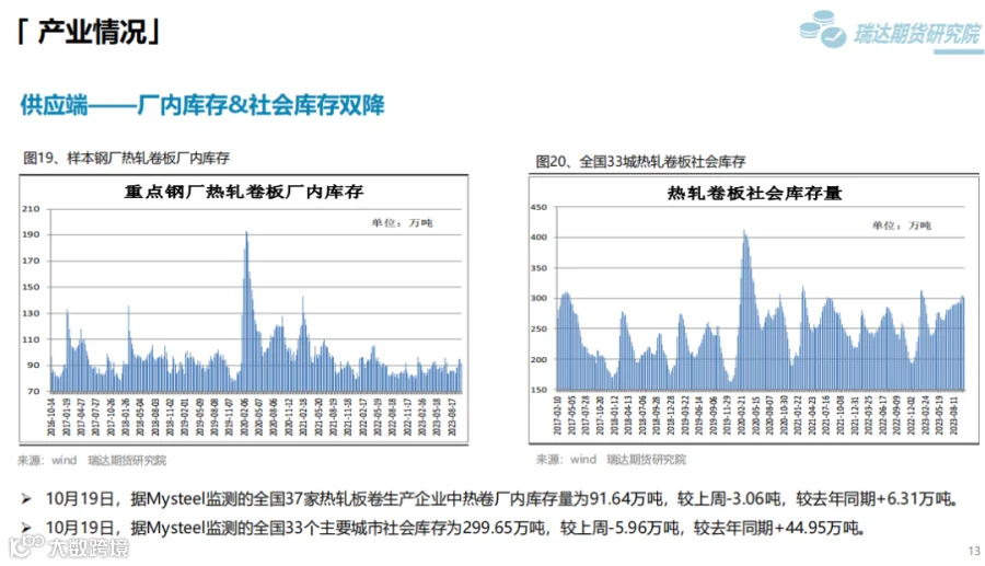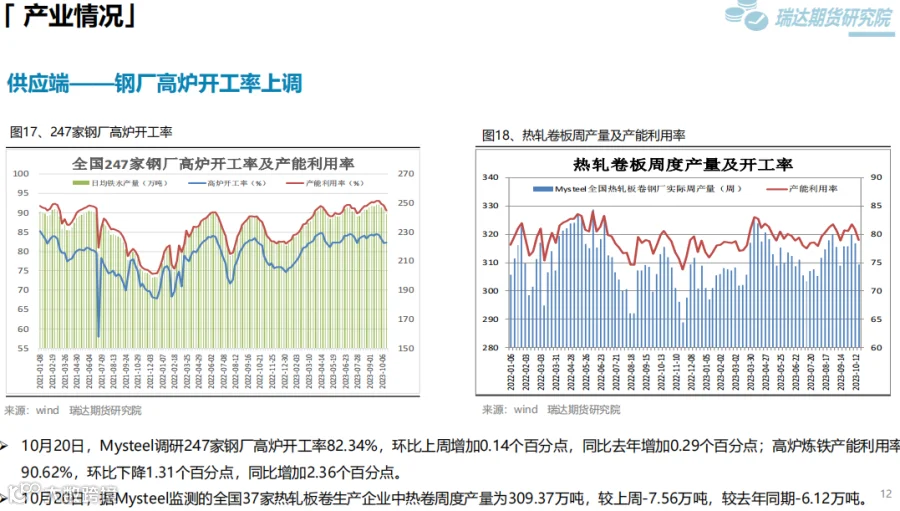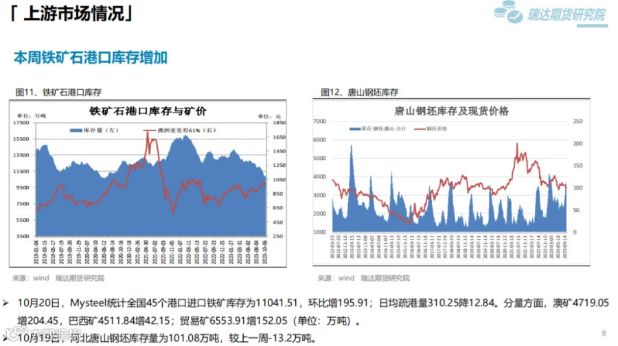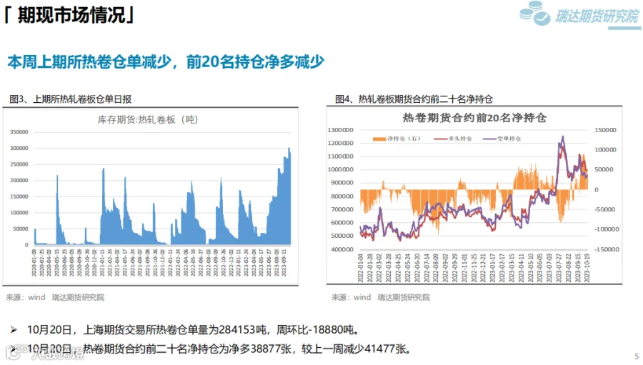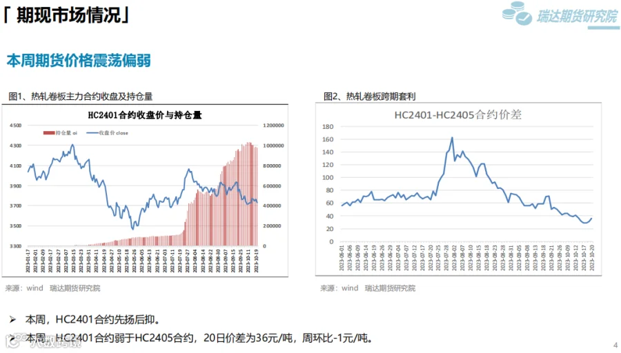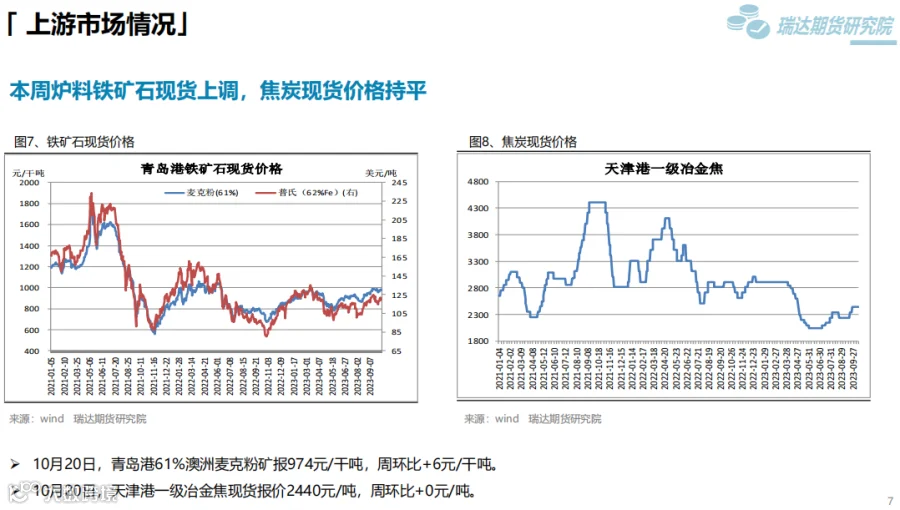 本周(10.13-10.20)热卷价格先扬后抑。周初钢价偏强运行,由于炉料走高提升炼钢成本,另外第三届“一带一路”国际合作高峰论坛于10月17日至18日在北京举行,在当前的国际形势下,本届高峰论坛备受关注,市场存在一定乐观预期。然而,现货市场终端采购整体表现一般,随着股市和炉料下行,后半周热卷价格承压走弱。下周(10.20-10.27)供应端,热卷周度产量继续回落,但周度产能利用率维持在80%附近。需求端,下游采购量有增加,库存量继续下滑,只是幅度不大,表观消费量仅小幅提升。最后,粗钢减产预期增强,将减少炉料需求,成本支撑下移的可能性提升将限制钢价反弹空间。