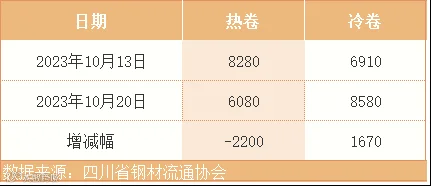 本周四川省钢材流通协会对样本钢厂关于板材出货量统计数据显示,热卷出货量6080吨,较上周减少2200吨。冷卷出货8580吨,较上周增加1670吨。