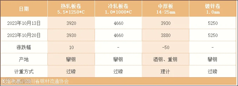 据四川省钢材流通协会对本周成都现货市场监测显示:热轧板卷较上周价格上涨10元/吨;冷轧板卷与上周价格相同;中厚板较上周价格下跌50元/吨;镀锌卷与上周价格相同。