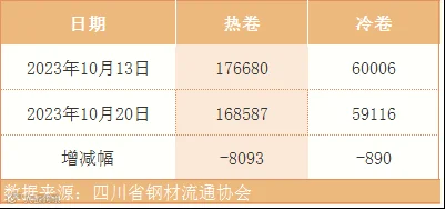 据四川省钢材流通协会统计,本周成都地区样本库房中热卷库存量为168587吨,较上周减少8093吨。冷卷库存量为59116吨,较上周减少890吨。
