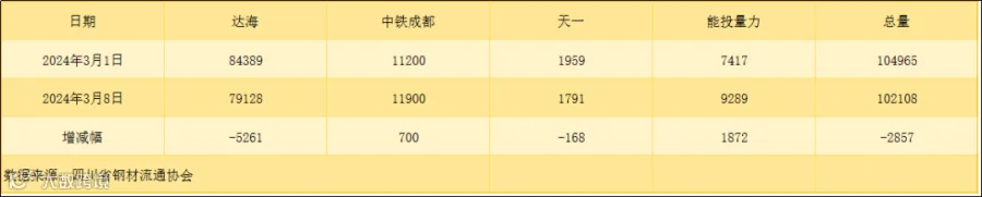 以上表单中的数据完全由川钢协信息统计部人员客观采集自相关钢厂、库房和贸易企业,川钢协力求数据及内容的准确、客观,但不能保证其完整性或准确性;本数据简报仅供浏览者参考,并不构成建议,川钢协不对该数据、简报及使用该数据和简报所导致的结果承担责任。