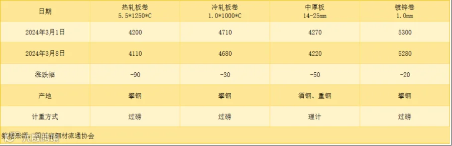 据四川省钢材流通协会对本周成都现货市场监测显示:热轧板卷较上周价格下跌90元/吨;冷轧板卷较上周价格下跌30元/吨;中厚板较上周价格下跌50元/吨;镀锌卷较上周价格下跌20元/吨。