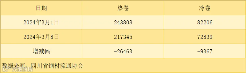 据四川省钢材流通协会统计,本周成都地区样本库房中热卷库存量为217345吨,较上周减少26463吨。冷卷库存量为72839吨,较上周减少9367吨。