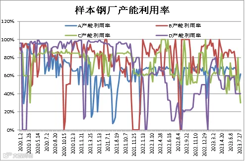 (7月28日-8月3日)四川省钢材流通协会对四家样本钢厂关于建材产能利用率统计数据显示,A、B较上周分别上调8%、4.52%;C较上周减少18%;D较上周持平。