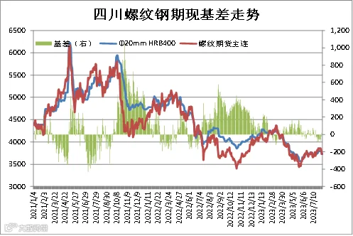 统计数据显示,成都建筑钢材现货价格与上期所螺纹钢期货价格存较强联动性,基差正常波动区间为-100-300元/吨。本期现货价格强于期货价格,8月4日成都Φ20mm HRB400现货价为3730元/吨,RB2310合约价格为3736元/吨,基差为-6元/吨,周环比+55元/吨。(备注:基差=现货-期货)