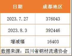 据四川省钢材流通协会统计,截止8月3日成都地区样本库房中螺纹钢及线材库存总量为392446吨,较上周增加16403吨,较去年同期增加45564吨。本期社会库存继续增加,由于受成都大运会影响,成都周边多数工地停工,加之高温雨水季节下施工放缓,市场成交明显下降。