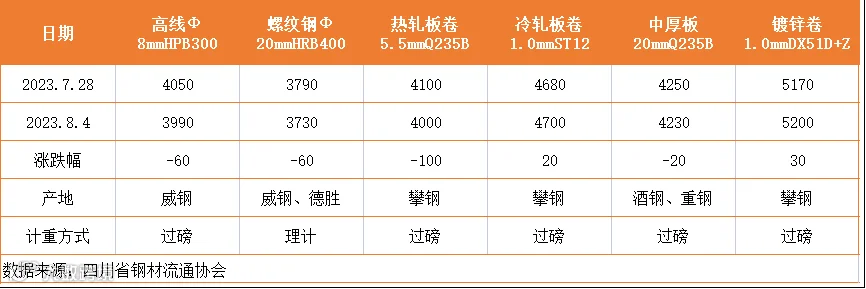 据四川省钢材流通协会对成都现货市场监测显示,本期建筑钢材价格震荡下行,受大运会影响周边多数施工停工,叠加期螺价格下调拖累现货报价。8月4日,成都地区Φ20mm HRB400螺纹钢价格为3730元/吨,较7月28日跌60元/吨;Φ8mm HPB300高线价格为3990元/吨,较上一周跌60元/吨。