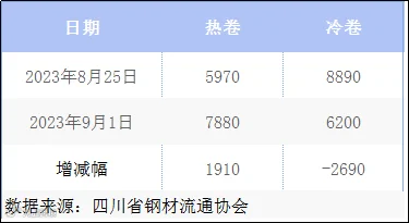 本周四川省钢材流通协会对样本钢厂关于板材出货量统计数据显示,热卷出货量7880吨,较上周增加1910吨。冷卷出货6200吨,较上周减少2690吨。