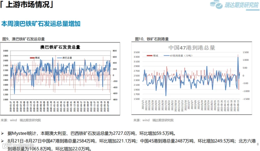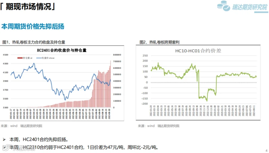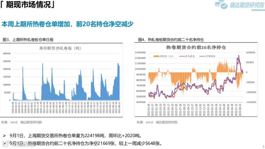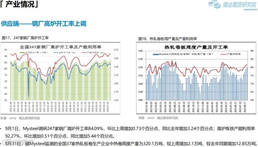 本周(8.25-9.1)热卷价格先抑后扬。周初炉料走弱,炼钢成本下移拖累热卷价格,随着央行、国家金融监管总局重磅宣布房贷政策调整,降低存量房贷利率,同时多城市相继官宣“认房不认贷”,房地产行业利好频发支撑黑色系期货走高,同时热卷表观消费量继续提升,推动价格扩大涨幅。下周(9.1-9.8)供应端,热卷周度产量延续小幅增加,周度产能利用率维持在80%上方。需求端,下游需求好于预期,库存下滑,表观消费量继续提升。最后,国内宏观面延续稳增长,扩内需利好政策,将继续提振市场信心。