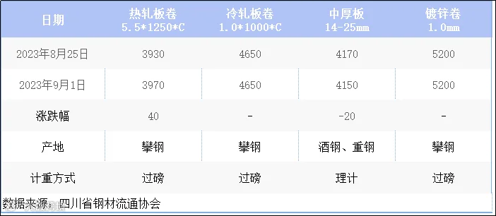 据四川省钢材流通协会对本周成都现货市场监测显示:热轧板卷较上周价格上涨40元/吨;冷轧板卷与上周价格相同;中厚板较上周价格下跌20元/吨;镀锌卷较与上周价格相同。