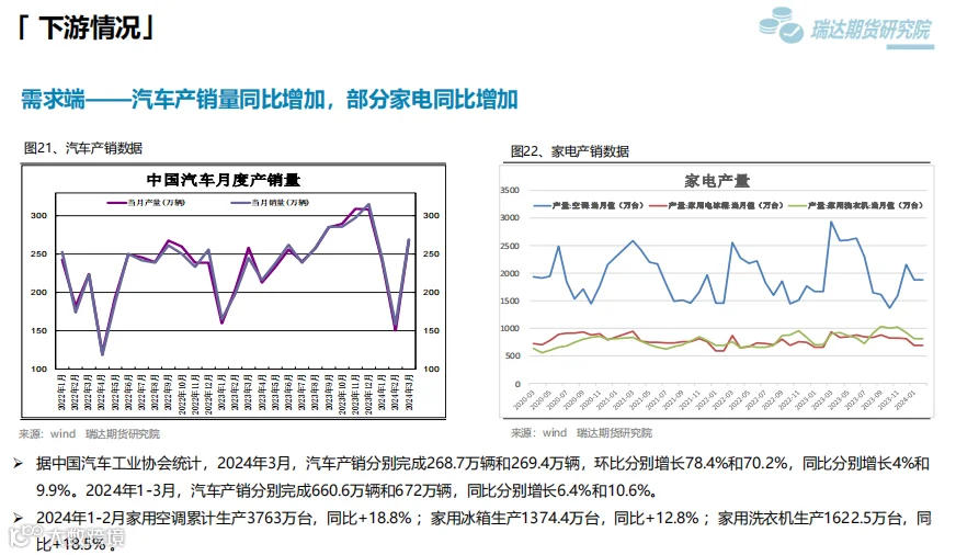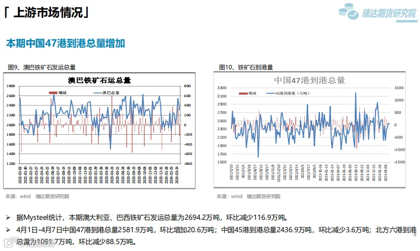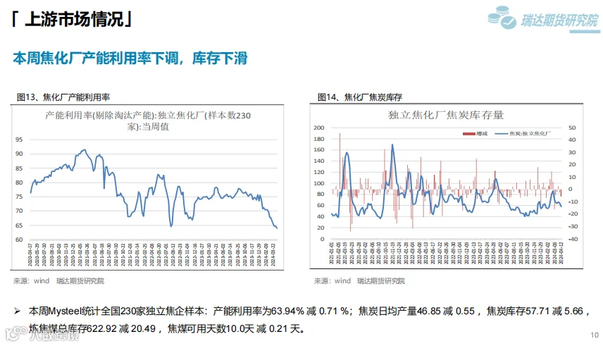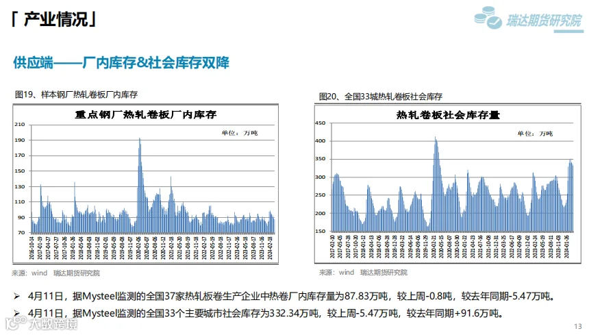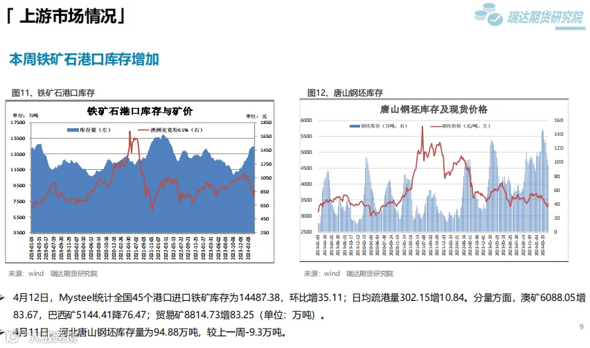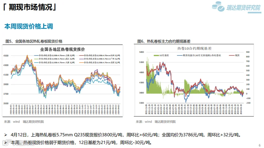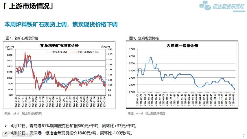 本周(4.7-4.12)热卷价格止跌反弹。随着原材料价格反弹,市场情绪回暖,热卷期现货价格也顺势走高,虽然热卷终端需求表现一般,库存去化缓慢,但黑色系全线反弹对热卷期现货价格同样构成支撑。 下周(4.12-4.19)供应端,本期热卷周度产量小幅下滑,但产能利用率维持在80%上方,钢厂仍将更多铁水向板材转移,现货供应压力增加。需求端,下游复产增多,但采购增量有限,库存量去化缓慢。最后,炉料走高提升炼钢成本,另外国家发改委副主任表示,商务部牵头的消费品以旧换新文件已印好,可能未来几天就会正式出台,对板材需求构成支撑。