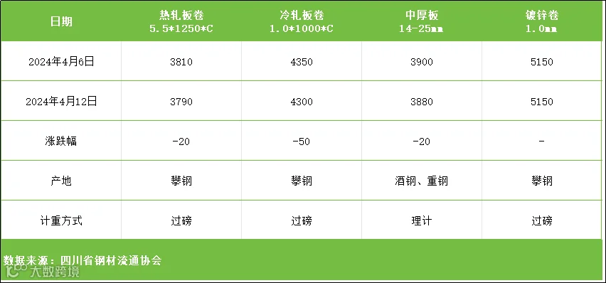 据四川省钢材流通协会对本周成都现货市场监测显示:热轧板卷较上周价格下跌20元/吨;冷轧板卷较上周价格下跌50元/吨;中厚板较上周价格下跌20元/吨;镀锌卷与上周价格相同。
