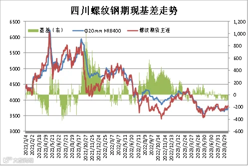 统计数据显示,成都建筑钢材现货价格与上期所螺纹钢期货价格存较强联动性,基差正常波动区间为-100-300元/吨。本期现货价格弱于期货价格,9月15日成都Φ20mm HRB400现货价为3740元/吨,RB2401合约期价为3824元/吨,基差为-84元/吨,周环比-67元/吨。(备注:基差=现货-期货)
