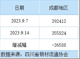 据四川省钢材流通协会统计,截止9月14日成都地区样本库房中螺纹钢及线材库存总量为355824吨,较上周减少36588吨,较去年同期减少187908吨。本期社会库存继续下滑,一方面产量下滑,另外需求尚可。