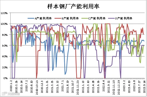 (9月8日-9月14日)四川省钢材流通协会对四家样本钢厂关于建材产能利用率统计数据显示,A、B较上周分别下调2%、11.18%;C较上周提升2%;D较上周持平。